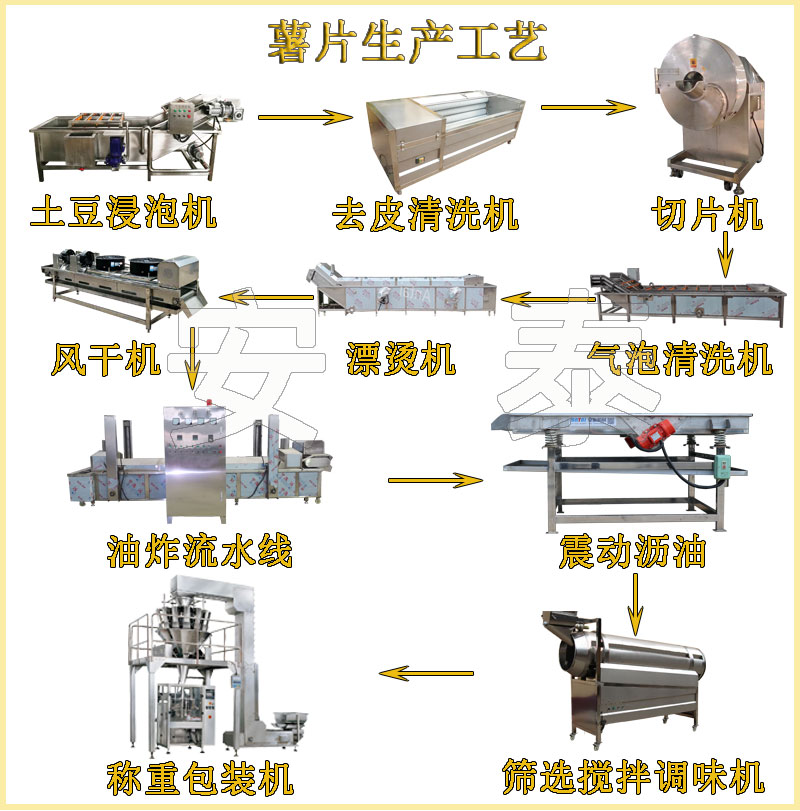 薯片工藝流程:土豆浸泡機 —— 上料提升機—— 清洗去皮機 —— 挑揀線 —— 提升機 —— 切片機 —— 漂洗線 —— 風冷瀝水機 —— 油炸線 —— 振動瀝油機 —— 調味拌料機—— 稱重包裝機